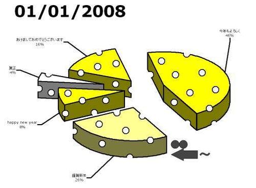 あけましておめでとうございます。今年もよろしくお願いいたします。今年の年賀状です。 ……ただ、まだ誰にも出していません。ていうか印刷すらしていません……。大晦日に作りました。 パワーポイントで作りました。チーズ(円グラフ)の穴だけは、bmpでスライ…